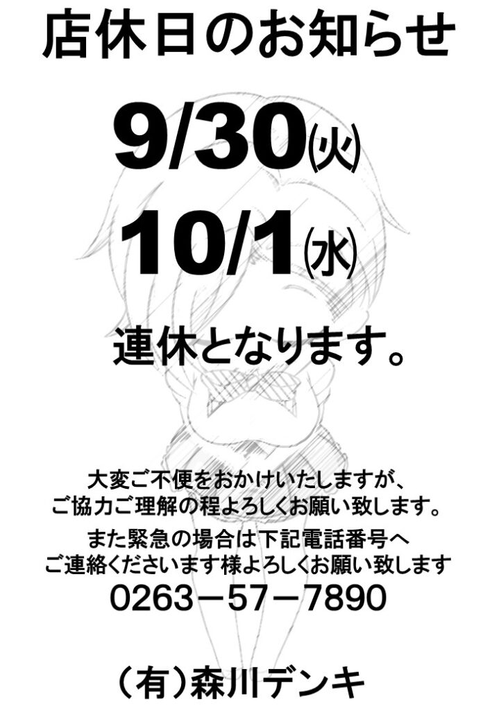 9/9、10は連休となります。ご不便をお掛けしますが御周知の程宜しくお願いします。