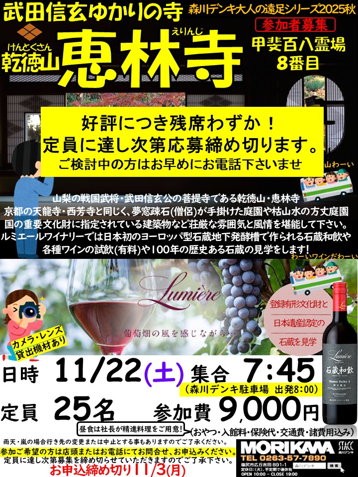 2025年10月6日 大人の遠足シリーズ2025秋!!(更新) STACC MORIKAWA イベント告知, イベント情報 STACCMORIKAWA, α, 森川デンキ 0 Comments 森川デンキ大人の遠足2025秋、行先が決定しました! 詳しくはコチラ