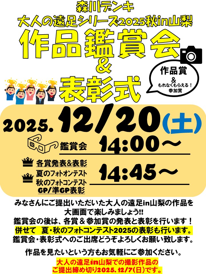 2025年11月30日 作品鑑賞会・表彰式のお知らせ。作品提出締め切り STACC MORIKAWA イベント告知, イベント情報 STACCMORIKAWA, 森川デンキ 0 Comments 作品鑑賞会・表彰式のお知らせです。 詳しくはコチラ