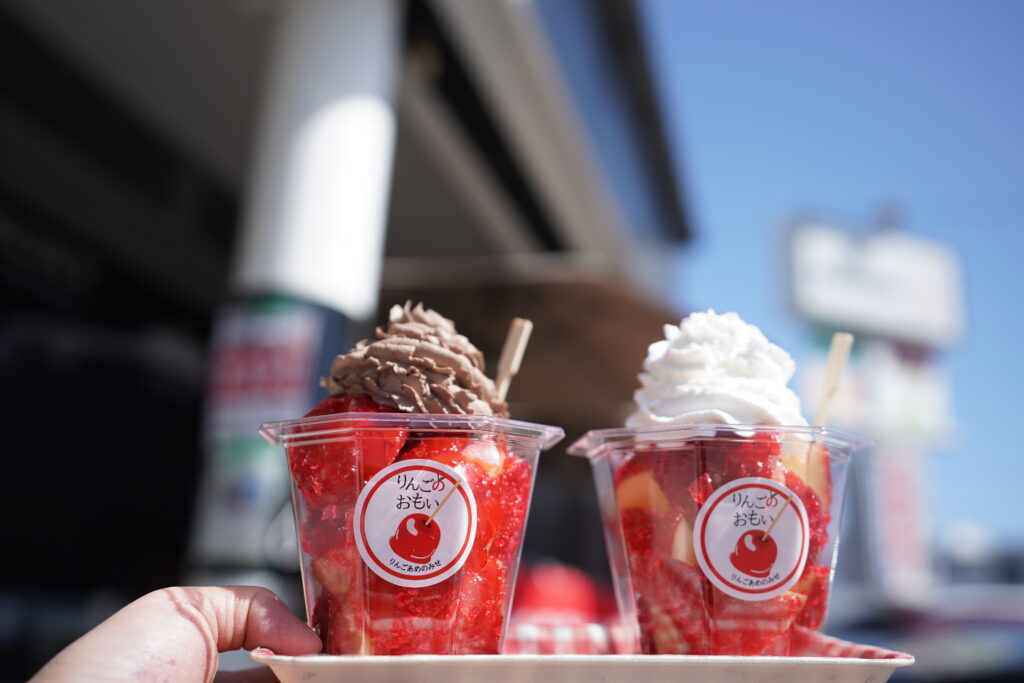 昔ながらのりんご飴から、カットしてホイップクリームなどトッピングされたりんご飴など、甘味に舌鼓。