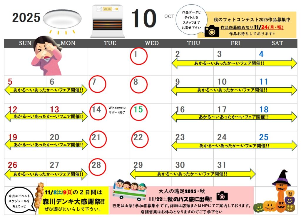 2025年9月29日 2025年10月カレンダー(更新) STACC MORIKAWA お知らせ STACCMORIKAWA, 森川デンキ 0 Comments 2025年10月のカレンダーです。(更新しました) 10月はあかる~い、あったか~いフェアを開催。日も短くなり、暗く寒くなってまいります。照明器具、暖房器具の新調、買替えのご相談を承っておりますので是非ご来店ください。 また、いよいよWindows10のサポートが10/14で終了となります。まだの方はお早めにご相談ください。 変更等ありましたら、こちらのHPで随時お知らせいたしますので、ご確認ください。