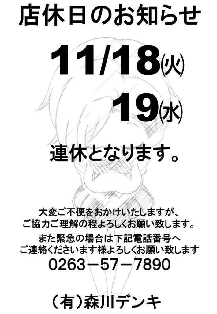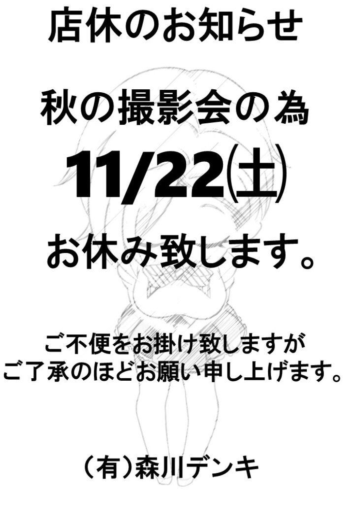 2025年11月17日 店休日のお知らせ/撮影会のお知らせ。 STACC MORIKAWA お知らせ STACCMORIKAWA, 森川デンキ 0 Comments 店休日のお知らせです。 11/18、19は連休となります。ご不便をお掛けしますが御周知の程宜しくお願いします。 また週末、11/22は撮影会の為お店がお休みとなります。 こちらも踏まえて御周知の程宜しくお願いします。