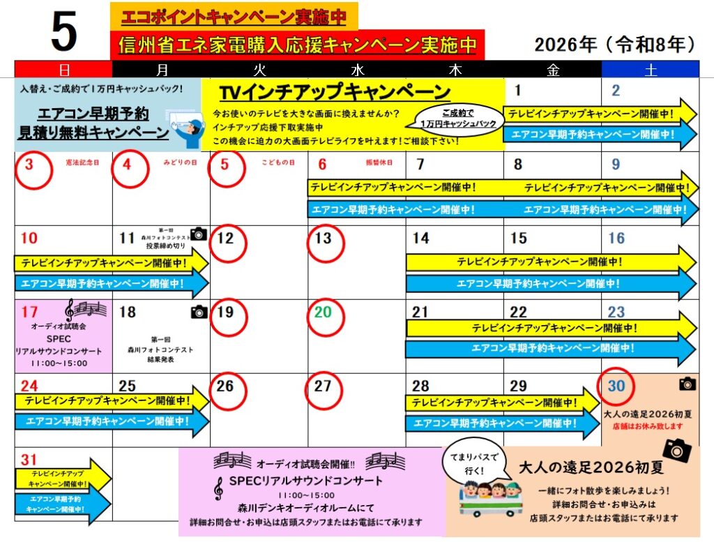 2026年4月3日 2026年5月カレンダー STACC MORIKAWA お知らせ STACCMORIKAWA, 森川デンキ 0 Comments 2026年5月のカレンダーです。 5月は、TVインチアップキャンペーン、エアコン早期予約見積り無料キャンペーンとオトクなキャンペーンがあります。これから暑くなるのでエアコンのご相談はお早めに。 また、5/17(日)は オーディオ試聴会があり、5/30(土)は恒例の大人の遠足があります。 詳細、変更等ありましたらこちらのHPで随時お知らせいたしますので、ご確認ください。