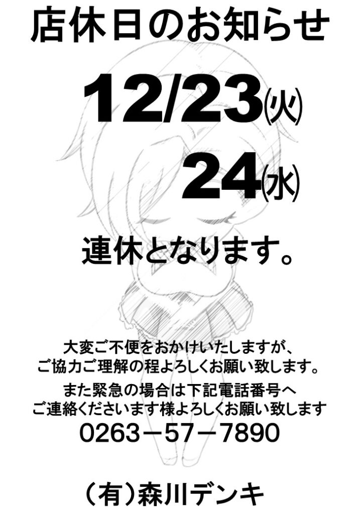 2025年12月7日 年末年始のお休みのお知らせ STACC MORIKAWA お知らせ, イベント告知 STACCMORIKAWA, 森川デンキ 0 Comments 年末年始のご案内です。 詳しくはコチラ